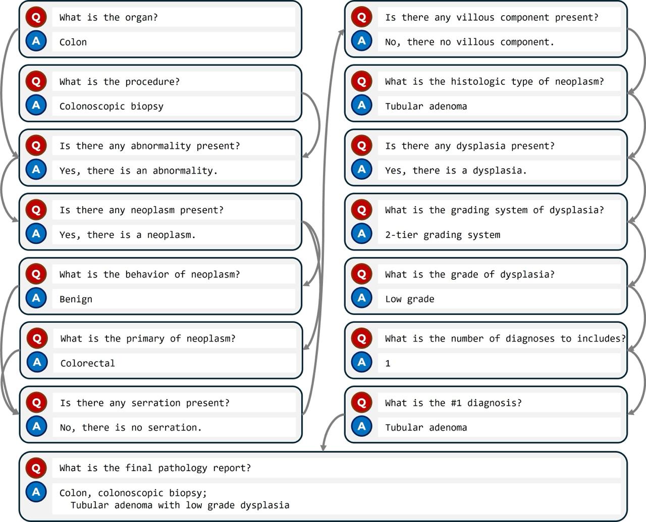 CoT data consists of a series of question-answer pairs constructed based on the actual pathology report writing process. Each Q&A pair is assigned a subsequent question following a logical sequence, and the series concludes with a question that produces the final report. Both the pathology reports and CoT dataset are provided as JSON objects.